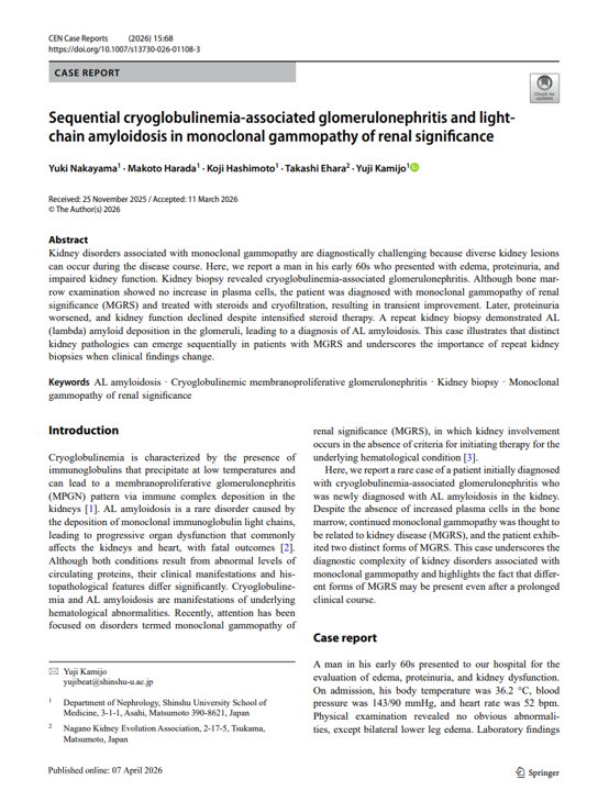 monoclonal gammopathy of renal significance(MGRS) の経過中に、クリオグロブリン血症関連糸球体腎炎 に続いて ALアミロイドーシス が出現した、まれな症例を報告しています。